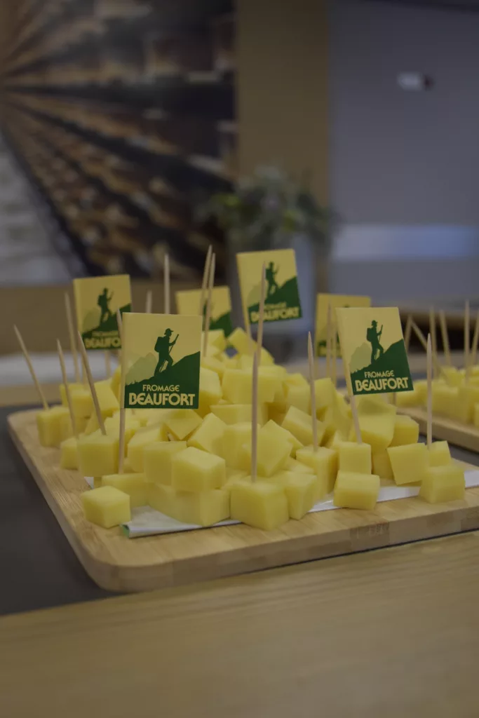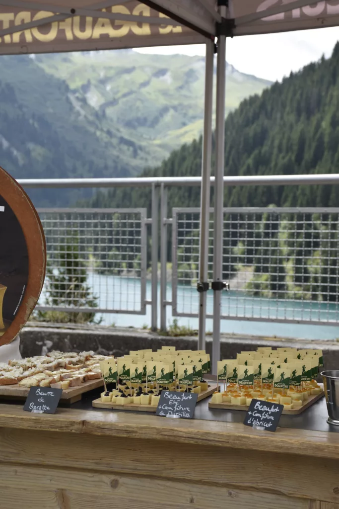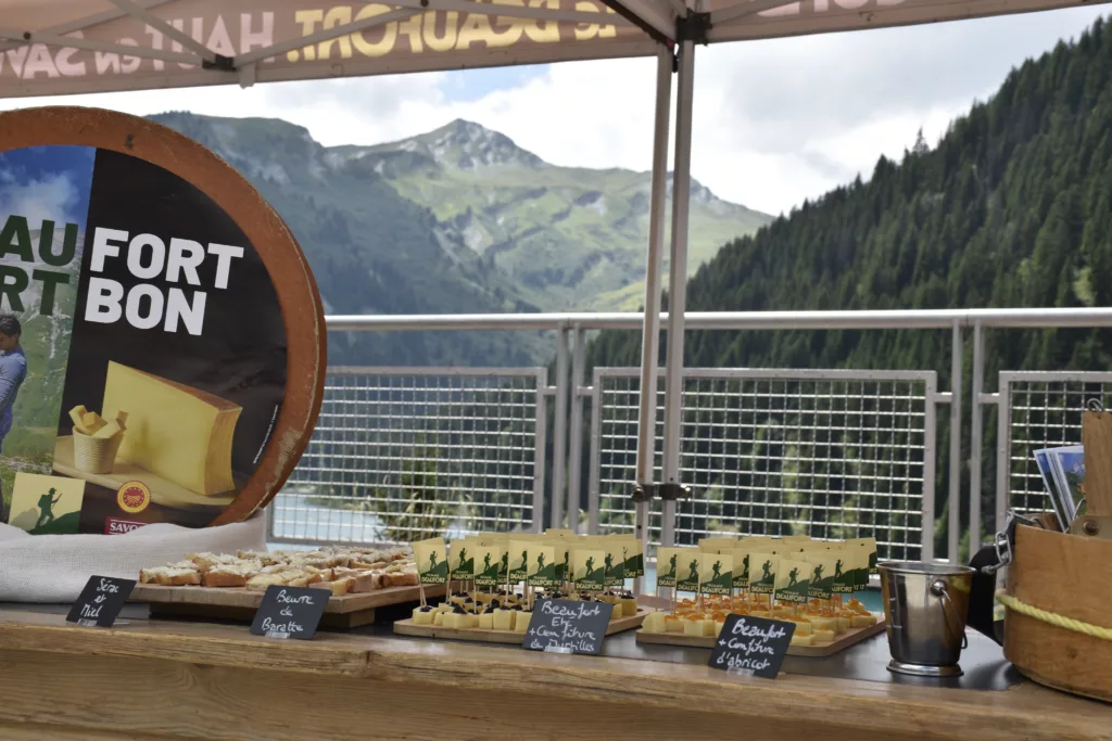 La randonnée se termine dans une exploitation laitière. Après un échange avec le producteur, notre mécène le Fromage Beaufort vous offre une dégustation : brut ou bien accordé avec des confitures, le Beaufort dévoile tous ses arômes !